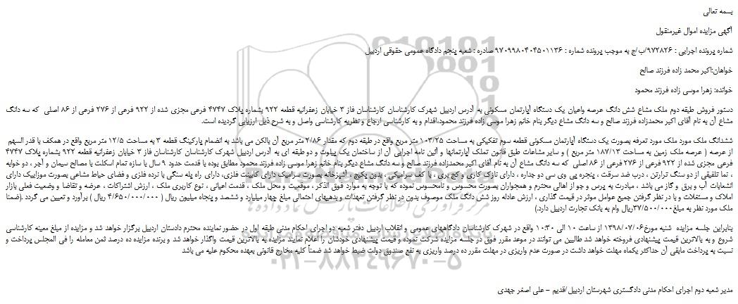 شماره پرونده اجرایی : 972826/ب/ج به موجب پرونده شماره : 9709980404501136 صادره : شعبه پنجم دادگاه عمومی حقوقی اردبیل