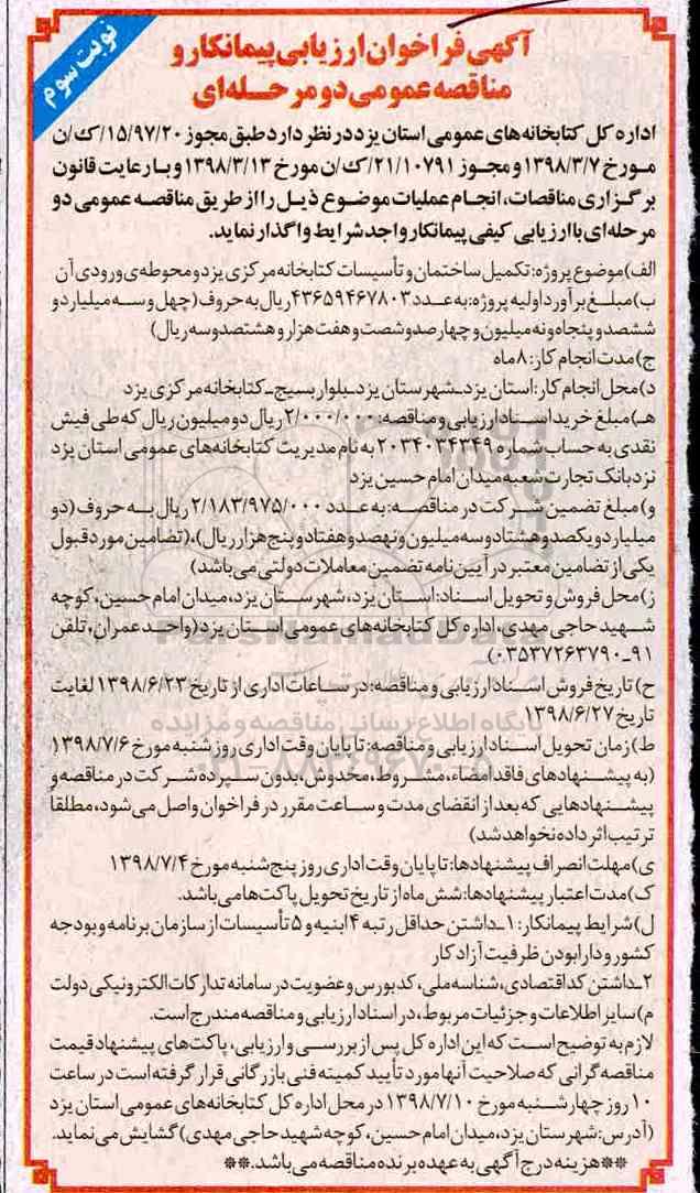 اداره کل کتابخانه های عمومی استان یزد برگزاری مناقصات انجام عملیات موضوع ذیل را ازطریق مناقصه عمومی دومرحله ای با ارزیابی کیفی پیمانکار واجد شرایط واگذار نماید