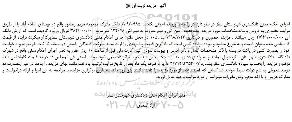 اجرای احکام مدنی دادگستری شهر ستان سقز در نظر دارد در رابطه با پرونده اجرائی بکلاسه 970985 ،3 دانگ ماترک مرحومه مریم رضاپور واقع در روستای اسلام آباد را از طریق مزایده حضوری به فروش برساند.مشخصات مورد مزایده: یک قطعه زمین آبی و دیم معروف به دیم آش 132068 متر مربع 5/282/000/000ریال برآورد گردیده است که ارزش دانگ آن 2/641/000/000 ریال میباشد . مزایده حضوری و در تاریخ 1398/7/23 ساعت10 در محل دفتر اجرای احکام مدنی دادگستری شهرستان سقزبرگزار میگردد،مزایده از قیمت کارشناسی شده بعنوان قیمت پایه شروع میشود و برنده مزایده کسی است که بالاترین قیمت پیشنهادی را ارائه نماید .شرکت کنندگان بایستی در سامانه ثنا ثبت نام نموده و درخواست خود را بصورت کتبی در پاکت در بسته با ذکر مشخصات کامل و ذکر آدرس و پیوست نمودن کپی کارت ملی قبل از ساعت 10 روز مقرر به دفتر اجرای احکام مدنی واقع در شهرک دانشگاه -دادگستری شهرستان سقزتحویل نمایند و به پیشنهادهای بعد از ساعت تعیین شده ترتیب اثر داده نمی شود .برنده بایستی فی المجلس ده درصد قیمت کارشناسی شده موضوع مزایده را بحساب سپرده دادگستری سقز بشماره 2171294253007 واریز و ظرف یک ماه بعد از تاریخ مزایده ترتیب پرداخت مانده بهای مزایده را بدهد در غیر اینصورت ده درصد تحویلی به نفع دولت ضبط خواهد شد.کسانی که قصد بازدید از مورد مزایده را داشته باشند پنج روز مانده به تاریخ برگزاری مزایده با مراجعه به این اجرا و ارائه دراخواست و مدارک هویتی و با اخذ مجوز وفق مقررات میتوانند از مورد مزایده بازدید بعمل آورند.