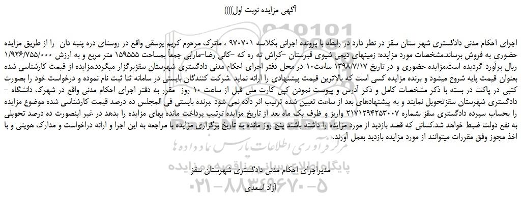 اجرای احکام مدنی دادگستری شهر ستان سقز در نظر دارد در رابطه با پرونده اجرائی بکلاسه 970701 ، ماترک مرحوم کریم یوسقی واقع در روستای دره پنبه دان را از طریق مزایده حضوری به فروش برساند.مشخصات مورد مزایده: زمینهای دیمی شیوی قبرستان -کراش ته ره که -کانی رضا-مارابی جمعاً بمساحت 159555 متر مربع و به ارزش 1/926/755/000 ریال برآورد گردیده است.مزایده حضوری و در تاریخ 1398/7/17 ساعت10 در محل دفتر اجرای احکام مدنی دادگستری شهرستان سقزبرگزار میگردد،مزایده از قیمت کارشناسی شده بعنوان قیمت پایه شروع میشود و برنده مزایده کسی است که بالاترین قیمت پیشنهادی را ارائه نماید .شرکت کنندگان بایستی در سامانه ثنا ثبت نام نموده و درخواست خود را بصورت کتبی در پاکت در بسته با ذکر مشخصات کامل و ذکر آدرس و پیوست نمودن کپی کارت ملی قبل از ساعت 10 روز مقرر به دفتر اجرای احکام مدنی واقع در شهرک دانشگاه -دادگستری شهرستان سقزتحویل نمایند و به پیشنهادهای بعد از ساعت تعیین شده ترتیب اثر داده نمی شود .برنده بایستی فی المجلس ده درصد قیمت کارشناسی شده موضوع مزایده را بحساب سپرده دادگستری سقز بشماره 2171294253007 واریز و ظرف یک ماه بعد از تاریخ مزایده ترتیب پرداخت مانده بهای مزایده را بدهد در غیر اینصورت ده درصد تحویلی به نفع دولت ضبط خواهد شد.کسانی که قصد بازدید از مورد مزایده را داشته باشند پنج روز مانده به تاریخ برگزاری مزایده با مراجعه به این اجرا و ارائه دراخواست و مدارک هویتی و با اخذ مجوز وفق مقررات میتوانند از مورد مزایده بازدید بعمل آورند.