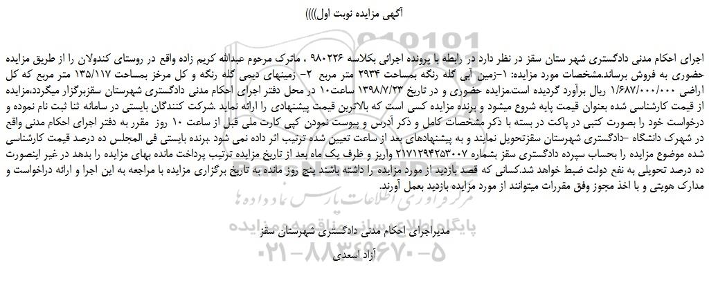 اجرای احکام مدنی دادگستری شهر ستان سقز در نظر دارد در رابطه با پرونده اجرائی بکلاسه 980226 ، ماترک مرحوم عبدالله کریم زاده واقع در روستای کندولان را از طریق مزایده حضوری به فروش برساند.مشخصات مورد مزایده: 1-زمین آبی گله رنگه بمساحت 2934 متر مربع 2- زمینهای دیمی گله رنگه و کل مرخز بمساحت 135/117 متر مربع که کل اراضی 1/687/000/000 ریال برآورد گردیده است.مزایده حضوری و در تاریخ 1398/7/23 ساعت10 در محل دفتر اجرای احکام مدنی دادگستری شهرستان سقزبرگزار میگردد،مزایده از قیمت کارشناسی شده بعنوان قیمت پایه شروع میشود و برنده مزایده کسی است که بالاترین قیمت پیشنهادی را ارائه نماید .شرکت کنندگان بایستی در سامانه ثنا ثبت نام نموده و درخواست خود را بصورت کتبی در پاکت در بسته با ذکر مشخصات کامل و ذکر آدرس و پیوست نمودن کپی کارت ملی قبل از ساعت 10 روز مقرر به دفتر اجرای احکام مدنی واقع در شهرک دانشگاه -دادگستری شهرستان سقزتحویل نمایند و به پیشنهادهای بعد از ساعت تعیین شده ترتیب اثر داده نمی شود .برنده بایستی فی المجلس ده درصد قیمت کارشناسی شده موضوع مزایده را بحساب سپرده دادگستری سقز بشماره 2171294253007 واریز و ظرف یک ماه بعد از تاریخ مزایده ترتیب پرداخت مانده بهای مزایده را بدهد در غیر اینصورت ده درصد تحویلی به نفع دولت ضبط خواهد شد.کسانی که قصد بازدید از مورد مزایده را داشته باشند پنج روز مانده به تاریخ برگزاری مزایده با مراجعه به این اجرا و ارائه دراخواست و مدارک هویتی و با اخذ مجوز وفق مقررات میتوانند از مورد مزایده بازدید بعمل آورند.