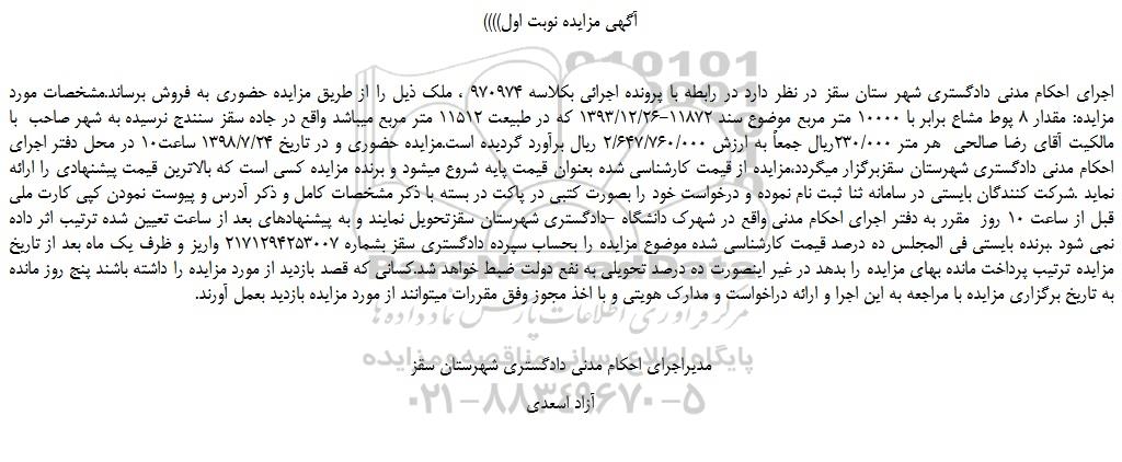 اجرای احکام مدنی دادگستری شهر ستان سقز در نظر دارد در رابطه با پرونده اجرائی بکلاسه 970974 ، ملک ذیل را از طریق مزایده حضوری به فروش برساند.مشخصات مورد مزایده: مقدار 8 پوط مشاع برابر با 10000 متر مربع موضوع سند 11872-1393/12/26 که در طبیعت 11512 متر مربع میباشد واقع در جاده سقز سنندج نرسیده به شهر صاحب  با مالکیت آقای رضا صالحی  هر متر 230/000ریال جمعاً به ارزش 2/647/760/000 ریال برآورد گردیده است.مزایده حضوری و در تاریخ 1398/7/24 ساعت10 در محل دفتر اجرای احکام مدنی دادگستری شهرستان سقزبرگزار میگردد،مزایده از قیمت کارشناسی شده بعنوان قیمت پایه شروع میشود و برنده مزایده کسی است که بالاترین قیمت پیشنهادی را ارائه نماید .شرکت کنندگان بایستی در سامانه ثنا ثبت نام نموده و درخواست خود را بصورت کتبی در پاکت در بسته با ذکر مشخصات کامل و ذکر آدرس و پیوست نمودن کپی کارت ملی قبل از ساعت 10 روز  مقرر به دفتر اجرای احکام مدنی واقع در شهرک دانشگاه -دادگستری شهرستان سقزتحویل نمایند و به پیشنهادهای بعد از ساعت تعیین شده ترتیب اثر داده نمی شود .برنده بایستی فی المجلس ده درصد قیمت کارشناسی شده موضوع مزایده را بحساب سپرده دادگستری سقز بشماره 2171294253007 واریز و ظرف یک ماه بعد از تاریخ مزایده ترتیب پرداخت مانده بهای مزایده را بدهد در غیر اینصورت ده درصد تحویلی به نفع دولت ضبط خواهد شد.کسانی که قصد بازدید از مورد مزایده را داشته باشند پنج روز مانده به تاریخ برگزاری مزایده با مراجعه به این اجرا و ارائه دراخواست و مدارک هویتی و با اخذ مجوز وفق مقررات میتوانند از مورد مزایده بازدید بعمل آورند.