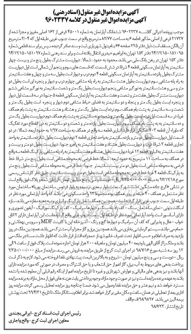 مزایده ششدانگ آپارتمان 82.77 مترمربع کلاسه 9602237