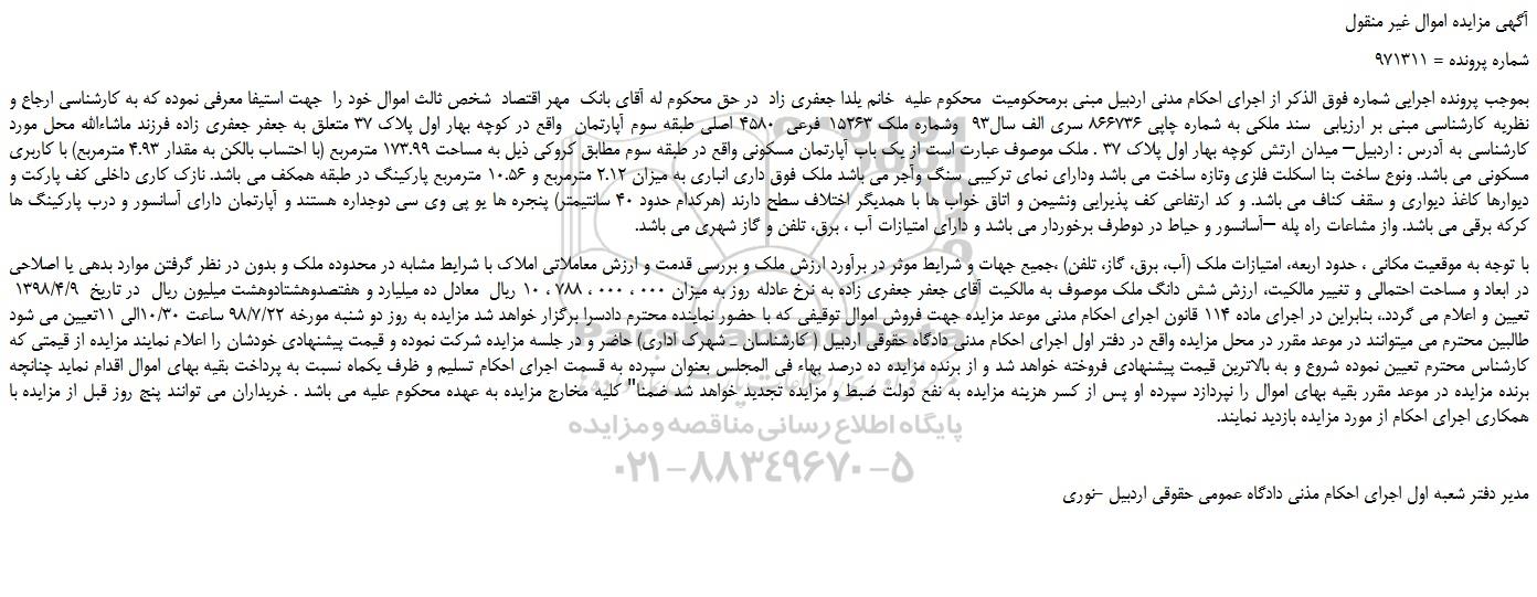 شعبه صادر کننده:شعبه اول اجرای احکام مدنی دادگستری شهرستان اردبیل/قدیم