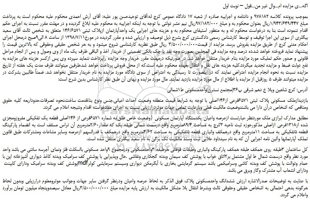 بموجب پرونده کلاسه 978182 و دادنامه و اجراییه صادره از شعبه 17 دادگاه عمومی کرج له:آقای توحیدحسن پور علیه: آقای آرش احمدی محکوم علیه محکوم است به پرداخت مبلغ 1/943/649/447ریال بعنوان محکوم به و مبلغ 97/182/000ریال نیم عشر دولتی .با توجه به اینکه اجراییه به محکوم علیه ابلاغ گردیده و در مهلت مقرر نسبت به اجرای حکم اقدام ننموده است بنا به درخواست محکوم له و به منظور استیفای محکوم به و هزینه های اجرایی یک واحدآپارتمان ازپلاک ثبتی 146/6571 متعلق به شخص ثالث آقای سعید بیگلری از سوی این اجرا توقیف و توسط کارشناس رسمی دادگستری کرج بشرح ذیل توصیف و ارزیابی شده و مقرر گردیده در مورخ1398/7/11 از ساعت 8 الی9صبح درمحل اجرای احکام مدنی کرج از طریق مزایده بفروش برسد. مزایده از قیمت3/500/000/000 ریال طبق نظریه کارشناسی شروع میشود و به هر شخص حقیقی وحقوقی که بالاترین قیمت را پیشنهاد نماید فروخته خواهد شد.ده درصد وجه مزایده فی المجلس بصورت وجه نقد یا چک بانکی تضمینی از خریدار اخذ و الباقی ظرف یک ماه از وی وصول و پس از انجام مراحل قانونی و صدور حکم تملیک مورد مزایده بنام خریدار منتقل خواهد شد. در صورتیکه درمهلت مقرر خریدار وجه مزایده راپرداخت ننماید سپرده وی پس ازکسر هزینه های مزایده به نفع دولت ضبط و مزایده تجدید میگردد.کلیه هزینه های نقل و انتقال بعهده محکوم علیه است.که از محل فروش پرداخت خواهد شد.طرفین میتوانند ظرف مدت یک هفته از تاریخ مزایده نسبت به نحوه انجام مزایده اعتراض نمایند که در اینصورت تا رسیدگی به اعتراض از سوی دادگاه مورد مزایده به نام خریدار منتقل نخواهد شد. ضمناً طالبین بشرکت در مزایده میتوانند ظرف 5 روزقبل از مزایده با اطلاع از مال مورد مزایده بازدید نمایند. مال مورد مزایده و بهای آن طبق نظر کارشناس بدین شرح است: