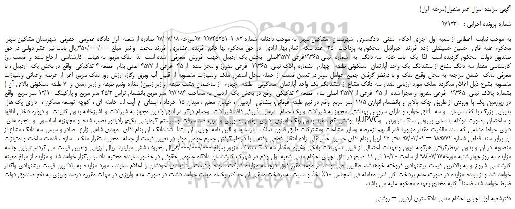 شعبه صادر کننده:شعبه اول اجرای احکام مدنی دادگستری شهرستان اردبیل/قدیم
