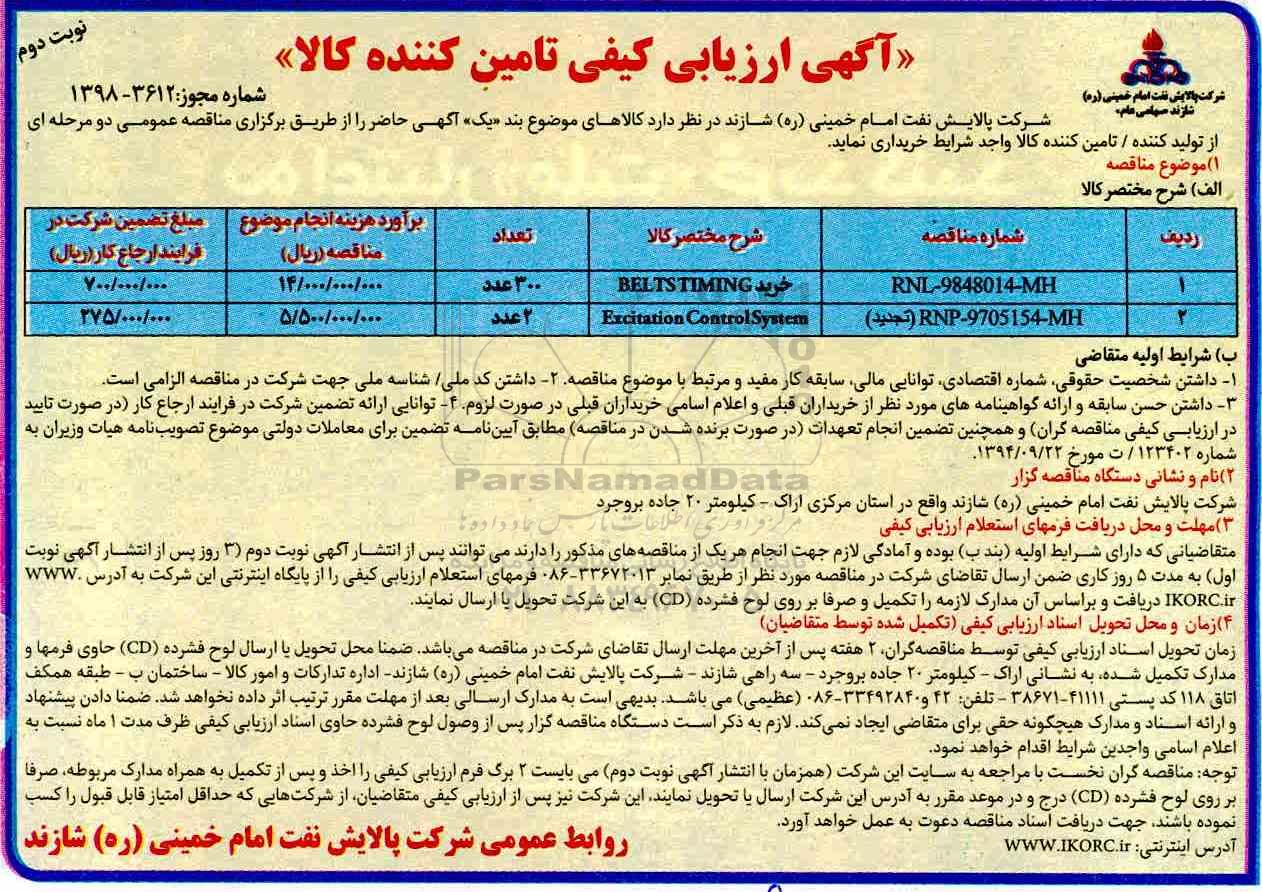 مناقصه ​خرید BELTS TIMING و ... نوبت دوم , آگهی ارزیابی تامین کنندگان کالا, مناقصه ​خرید BELTS TIMING و ... نوبت دوم