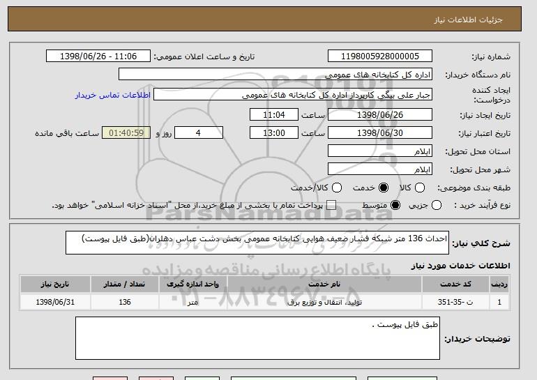 شرح کلی نیاز: احداث 136 متر شبکه فشار ضعیف هوایی کتابخانه عمومی بخش دشت عباس دهلران(طبق فایل پیوست)
