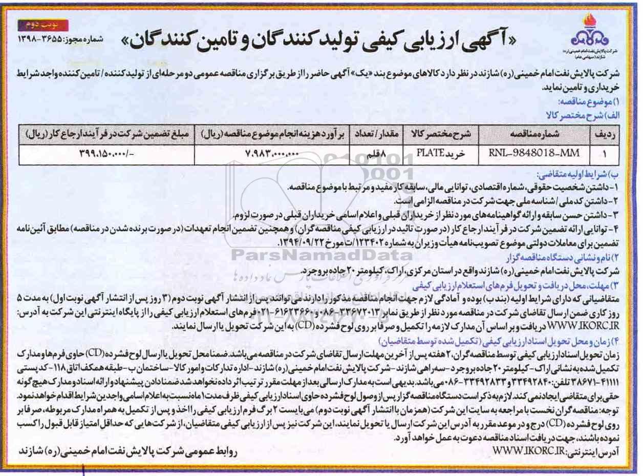 ارزیابی کیفی خرید PLATE نوبت دوم , آگهی ارزیابی کیفی , ارزیابی کیفی خرید PLATE نوبت دوم