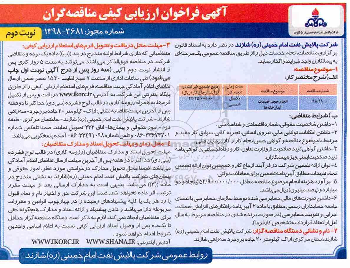 شرکت پالایش نفت امام خمینی (ره) شازند در نظر دارد انجام خدمات ذیل را از طریق مناقصه عمومی یک مرحله ای به پیمانکاران واجد شرایط واگذار نماید