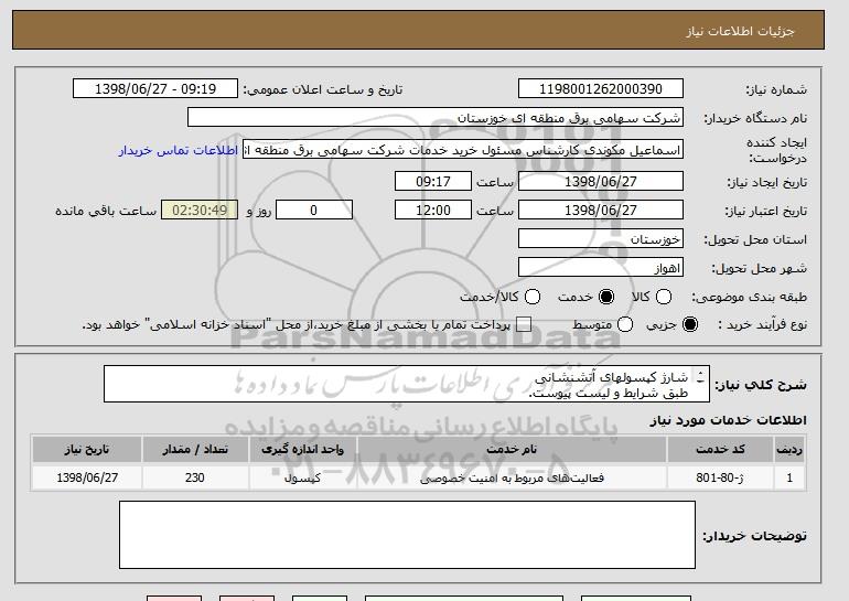 شرح کلی نیاز: شارژ کپسولهای آتشنشانی طبق شرایط و لیست پیوست. 230 کپسول