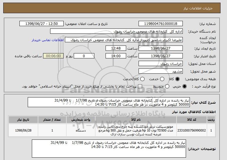توضیحات خریدارنیاز به راننده در اداره کل کتابخانه های عمومی خراسان رضوی از تاریخ 1/7/98 تا 31/4/99