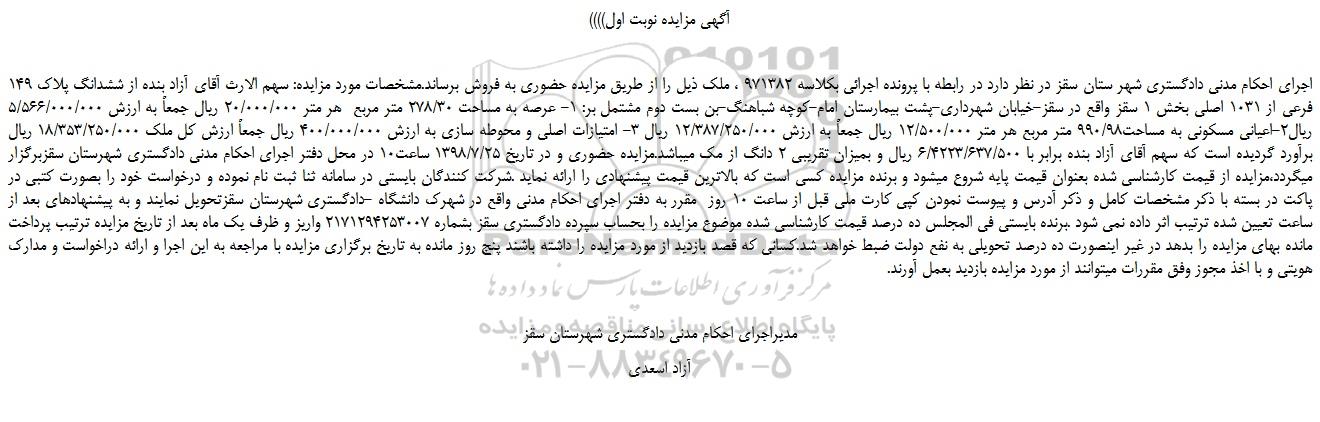 اجرای احکام مدنی دادگستری شهر ستان سقز در نظر دارد در رابطه با پرونده اجرائی بکلاسه 971382 ، ملک ذیل را از طریق مزایده حضوری به فروش برساند.مشخصات مورد مزایده: سهم الارث آقای آزاد بنده از ششدانگ پلاک 149 فرعی از 1031 اصلی بخش 1 سقز واقع در سقز-خیابان شهرداری-پشت بیمارستان امام-کوچه شباهنگ-بن بست دوم مشتمل بر: 1- عرصه به مساحت 278/30 متر مربع هر متر 20/000/000 ریال جمعاً به ارزش 5/566/000/000 ریال2-اعیانی مسکونی به مساحت990/98 متر مربع هر متر 12/500/000 ریال جمعاً به ارزش 12/387/250/000 ریال 3- امتیازات اصلی و محوطه سازی به ارزش 400/000/000 ریال جمعاً ارزش کل ملک 18/353/250/000 ریال برآورد گردیده است که سهم آقای آزاد بنده برابر با 6/4223/637/500 ریال و بمیزان تقریبی 2 دانگ از مک میباشد.مزایده حضوری و در تاریخ 1398/7/25 ساعت10 در محل دفتر اجرای احکام مدنی دادگستری شهرستان سقزبرگزار میگردد،مزایده از قیمت کارشناسی شده بعنوان قیمت پایه شروع میشود و برنده مزایده کسی است که بالاترین قیمت پیشنهادی را ارائه نماید .شرکت کنندگان بایستی در سامانه ثنا ثبت نام نموده و درخواست خود را بصورت کتبی در پاکت در بسته با ذکر مشخصات کامل و ذکر آدرس و پیوست نمودن کپی کارت ملی قبل از ساعت 10 روز مقرر به دفتر اجرای احکام مدنی واقع در شهرک دانشگاه -دادگستری شهرستان سقزتحویل نمایند و به پیشنهادهای بعد از ساعت تعیین شده ترتیب اثر داده نمی شود .برنده بایستی فی المجلس ده درصد قیمت کارشناسی شده موضوع مزایده را بحساب سپرده دادگستری سقز بشماره 2171294253007 واریز و ظرف یک ماه بعد از تاریخ مزایده ترتیب پرداخت مانده بهای مزایده را بدهد در غیر اینصورت ده درصد تحویلی به نفع دولت ضبط خواهد شد.کسانی که قصد بازدید از مورد مزایده را داشته باشند پنج روز مانده به تاریخ برگزاری مزایده با مراجعه به این اجرا و ارائه دراخواست و مدارک هویتی و با اخذ مجوز وفق مقررات میتوانند از مورد مزایده بازدید بعمل آورند.