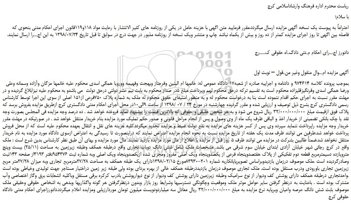 بموجب پرونده کلاسه 974614 و دادنامه و اجراییه صادره از شعبه17 دادگاه عمومی له: خانمها ام البنین وفرحناز وبهجت وفهیمه وورویا همگی اسدی محکوم علیه خانمها مزگان وآزاده وسمانه وعلی ورضا همگی اسدی وفرنگیزقلیزاده محکوم است به تقسیم ترکه درحق محکوم لهم وپرداخت مبلغ 5در صداز محکوم به بابت نیم عشر دولتی درحق دولت می باشدو به محکوم علیه نیزابلاغ گردیده و در مهلت مقرر نسبت به اجرای حکم اقدام ننموده است بنا به درخواست محکوم له و به منظور استیفای حقوق محکوم له ملک به شماره پلاک 750فرعی از151 اصلی از سوی این اجرا توسط کارشناس رسمی دادگستری کرج بشرح ذیل توصیف و ارزیابی شده و مقرر گردیده چهارشنبه در مورخ 24 / 07 /1398 از ساعت 9الی10در محل اجرای احکام مدنی دادگستری کرج ازطریق مزایده بفروش برسد که پلاک فوق ازقیمت مبلغ 32/000/000/000 ریال شروع می شود و به هر شخص حقیقی و حقوقی که بالاترین قیمت را پیشنهاد نماید فروخته خواهد شد . ده درصد وجه مزایده فی المجلس بصورت وجه نقد یا چک بانکی تضمینی از خریدار اخذ و الباقی ظرف یک ماه از وی وصول و پس از انجام مراحل قانونی و صدور حکم تملیک مورد مزایده بنام خریدار منتقل خواهد شد . در صورتیکه در مهلت مقرر خریدار وجه مزایده راپرداخت ننماید سپرده وی پس از کسر هزینه های مزایده به نفع دولت ضبط و مزایده تجدید میگردد.کلیه هزینه های نقل و انتقال بعهده محکوم علیه است که از محل فروش پرداخت خواهد شد.طرفین می توانند ظرف مدت یک هفته از تاریخ مزایده نسبت به نحوه انجام مزایده اعتراض نمایند که دراینصورت تا رسیدگی به اعتراض ازسوی دادگاه مورد مزایده به نام خریدار منتقل نخواهد شد.ضمناً طالبین بشرکت در مزایده می توانند ظرف 5 روز قبل از مزایده با اطلاع از مال مورد مزایده بازدید نمایند. مال مورد مزایده و بهای آن طبق نظر کارشناس بدین شرح است : ملک واقع در کرج رجائی شهر خیابان آزادی ابتدای خیابان سوم شرقی می باشد. مشخصات ملک شامل شش دانگ دوباب تجاری واقع درطبقه همکف وطبقه زیرزمین به مساحت (25/11) بیست وپنج مترویازده دسیمترمربع قطعه دوم تفکیکی از پلاک هفتصدوپنجاه فرعی از یکصدوپنجاه ویک اصلی مفروز ومجزی شده ازیکصدوپنجاه ویک اصلی وبه شماره ثبت 954376دفتر 3193از صفحه 143ثبت وصادرگردیده است .ملک موصوف درزمان بازدیدوبراساس تصویرپایانکاربه شماره 201-83930مورخ 1398/02/15دارای یک طبقه همکف به مساحت 27/28مترمربع تجاری وبه میزان 27/28متر مربع زیرزمین تجاری باورودی ودرب مستقل بوده است. ملک تجاری موصوف درزمان بازدیددرطبقه همکف خالی از بهره بردای بوده ولی طبقه زیر زمین دراختیار مستاجر جهت تولیدی وخیاطی بوده است .واحدتجاری درطبقه همکف دارای پوشش کف ودیوار از نوع سرامیک وطبقه زیرزمین دارای پوشش کف ودیوار از نوع دیوارپوشش بادرب کرکره برقی مستقل وباکلیه انشعابات برق وگاز اختصاصی وآب مشترک بوده است . باعنایت به درنظر گرفتن سایر عوامل موثر ملک وموقعیت وچگونگی دسترسیها وشرایط روز بازار وبدون درنظرگرفتن هر گونه واگذاریها وبدهی به اشخاص حقوقی وحقیقی ملک موصوف بابت شش دانگ عرصه واعیان وبرپایه نرخ مزایده به مبلغ 32/000/000/000 ریال معادل سه میلیاردودویست میلیون تومان موردارزیابی ومزایده اعلام میگردد.دادورزاجرای احکام مدنی دادگاه حقوقی کرج