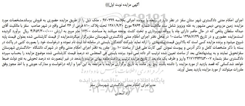 اجرای احکام مدنی دادگستری شهر ستان سقز در نظر دارد در رابطه با پرونده اجرائی بکلاسه 970299 ، ملک ذیل را از طریق مزایده حضوری به فروش برساند.مشخصات مورد مزایده: زمین مزروعی دیمی مشهور به خله ویزویز شامل سند مالکیت شماره 4864 مورخ 1381/9/30 تحت پلاک 810 فرعی از 36 اصلی واقع در شهر صاحب سقز با مالکیت آقای عبداله سلطان پناهی که در حال حاضر دارای چاه با پروانه بهربرداری و تحت کشت یونجه میباشد به مساحت 17200 متر مربع به ارزش 4/653/300/000 ریال برآورد گردیده است.مزایده حضوری و در تاریخ 1398/7/29 ساعت10 در محل دفتر اجرای احکام مدنی دادگستری شهرستان سقزبرگزار میگردد،مزایده از قیمت کارشناسی شده بعنوان قیمت پایه شروع میشود و برنده مزایده کسی است که بالاترین قیمت پیشنهادی را ارائه نماید .شرکت کنندگان بایستی در سامانه ثنا ثبت نام نموده و درخواست خود را بصورت کتبی در پاکت در بسته با ذکر مشخصات کامل و ذکر آدرس و پیوست نمودن کپی کارت ملی قبل از ساعت 10 روز مقرر به دفتر اجرای احکام مدنی واقع در شهرک دانشگاه -دادگستری شهرستان سقزتحویل نمایند و به پیشنهادهای بعد از ساعت تعیین شده ترتیب اثر داده نمی شود .برنده بایستی فی المجلس ده درصد قیمت کارشناسی شده موضوع مزایده را بحساب سپرده دادگستری سقز بشماره 2171294253007 واریز و ظرف یک ماه بعد از تاریخ مزایده ترتیب پرداخت مانده بهای مزایده را بدهد در غیر اینصورت ده درصد تحویلی به نفع دولت ضبط خواهد شد.کسانی که قصد بازدید از مورد مزایده را داشته باشند پنج روز مانده به تاریخ برگزاری مزایده با مراجعه به این اجرا و ارائه دراخواست و مدارک هویتی و با اخذ مجوز وفق مقررات میتوانند از مورد مزایده بازدید بعمل آورند.