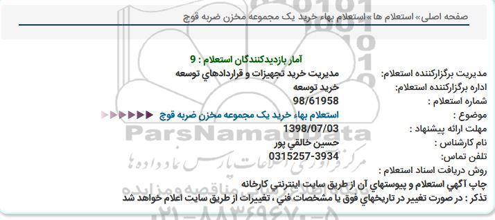 موضوع : استعلام بهاء خرید یک مجموعه مخزن ضربه قوچ