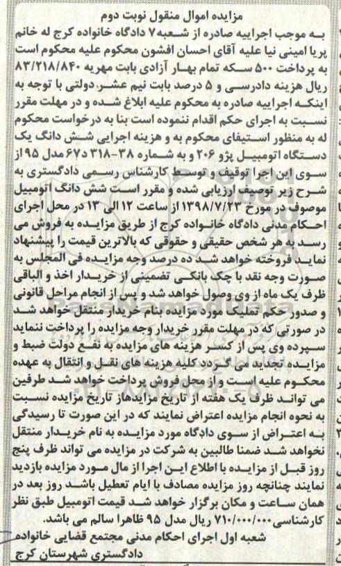 زمان و مکان مزایده: مورخ 98.07.23 از ساعت 12 الی 13 در محل اجرای احکام مدنی دادگاه خانواده کرج