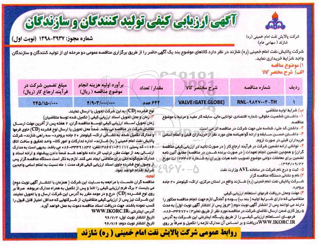 شرکت پالایش نفت امام خمینی (ره) شازند در نظر دارد کالاهای موضوع بند یک آگهی حاضر را از طریق برگزاری مناقصه عمومی دو مرحله ای از تولیدکنندگان و سازندگان واجد شرایط خریداری نماید