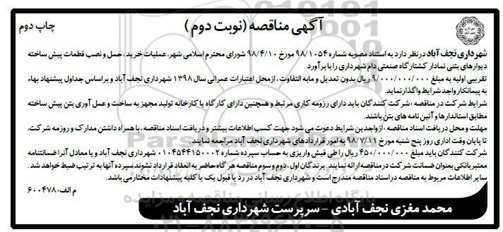 شهرداری نجف آباد در نظر دارد به استناد مصوبه شماره 1054/ 98 مورخ 98.4.10 شورای محترم اسلامی شهر، عملیات خرید، حمل و نصب قطعات پیش ساخته دیوارهای بتنی نمادار کشتارگاه صنعتی دام شهرداری را با برآورد تقریبی اولیه به مبلغ 9.000.000.000 ریال بدون تعدیل و مابه التفاوت از محل اعتبارات عمرانی سال 98 شهرداری نجف آباد و براساس جداول پیشنهاد بها به پمانکار واجد شرایط واگذار نماید
