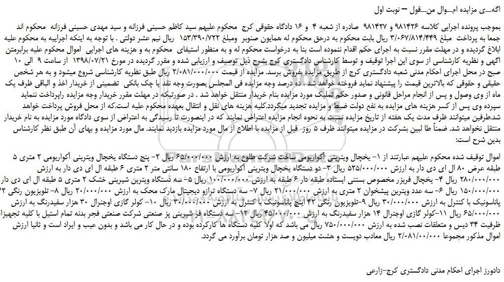 بموجب پرونده اجرایی کلاسه 981426 و 981427  صادره از شعبه 4  و 16 دادگاه حقوقی کرج  محکوم علیهم سید کاظم حسینی فرزانه و سید مهدی حسینی فرزانه  محکوم اند جمعا به پرداخت  مبلغ 3/067/814/449 ریال بابت محکوم به درحق محکوم له همایون صنوبر  ومبلغ 153/390/722  ریال نیم عشر دولتی . با توجه به اینکه اجراییه به محکوم علیه ابلاغ گردیده و در مهلت مقرر نسبت به اجرای حکم اقدام ننموده است بنا به درخواست محکوم له و به منظور استیفای  محکوم به و هزینه های اجرایی  اموال محکوم علیه برابرمتن اگهی و نظریه کارشناسی از سوی این اجرا توقیف و توسط کارشناس دادگستری کرج بشرح ذیل توصیف و ارزیابی شده و مقرر گردیده در مورخ 1398/07/21  از ساعت 9  الی 10 صبح در محل اجرای احکام مدنی شعبه دادگستری کرج از طریق مزایده بفروش برسد. مزایده از قیمت 2/081/000/000 ریال طبق نظریه کارشناسی شروع میشود و به هر شخص  حقیقی و حقوقی که بالاترین قیمت را پیشنهاد نماید فروخته خواهد شد . ده درصد وجه مزایده فی المجلس بصورت وجه نقد یا چک بانکی  تضمینی از خریدار اخذ و الباقی ظرف یک ماه از وی وصول و پس از انجام مراحل قانونی و صدور حکم تملیک مورد مزایده بنام خریدار منتقل خواهد شد . در صورتیکه در مهلت مقرر خریدار وجه مزایده راپرداخت ننماید سپرده وی پس از کسر هزینه های مزایده به نفع دولت ضبط و مزایده تجدید میگردد.کلیه هزینه های نقل و انتقال بعهده محکوم علیه است.که از محل فروش پرداخت خواهد شد.طرفین میتوانند ظرف مدت یک هفته از تاریخ مزایده نسبت به نحوه انجام مزایده اعتراض نمایند که در اینصورت تا رسیدگی به اعتراض از سوی دادگاه مورد مزایده به نام خریدار منتقل نخواهد شد. ضمناً طا لبین بشرکت در مزایده میتوانند ظرف 5 روز  قبل از مزایده با اطلاع از مال مورد مزایده بازدید نمایند. مال مورد مزایده و بهای آن طبق نظر کارشناس بدین شرح است: