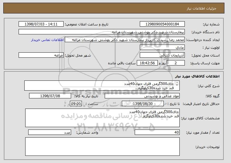 استعلام چای500گرمی فلزی جهان40عدد قند خرد شده30کیلوگرم طبق استعلام پیوستی, استعلام چای500گرمی فلزی جهان40عدد قند خرد شده30کیلوگرم طبق استعلام پیوستی