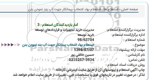 موضوع : استعلام بهاء انتخاب پیمانکار جهت آب بند نمودن بتن
