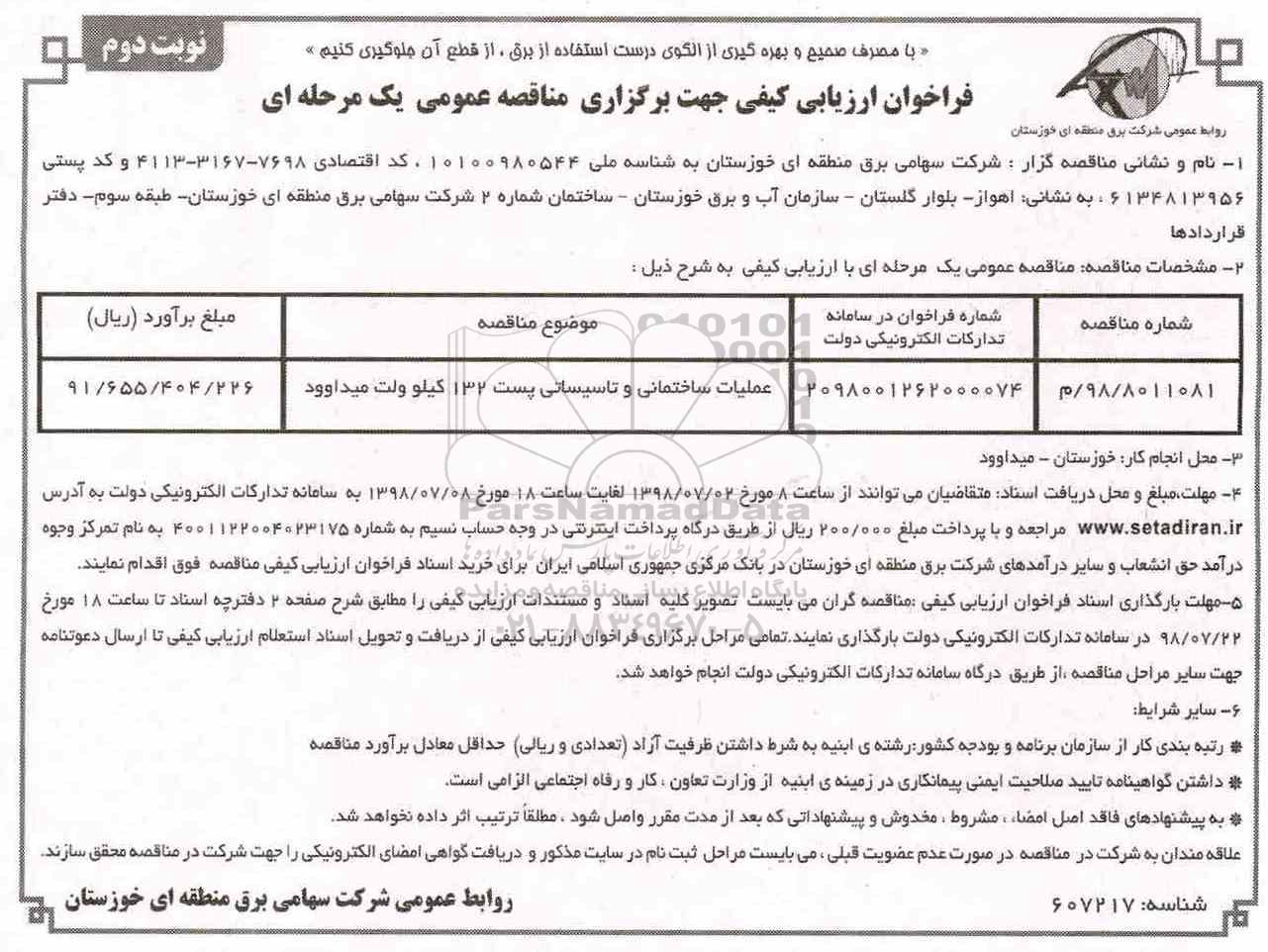 | 98/8011081/م | 2098001262000074 | عملیات ساختمانی و تاسیساتی پست 132 کیلوولت مید اوود |
