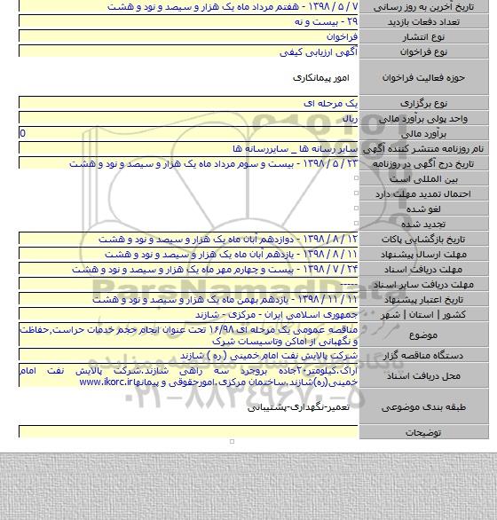 مناقصه عمومی یک مرحله ای ۱۶/۹۸ تحت عنوان انجام حجم خدمات حراست٫حفاظت و نگهبانی از اماکن وتاسیسات شرک