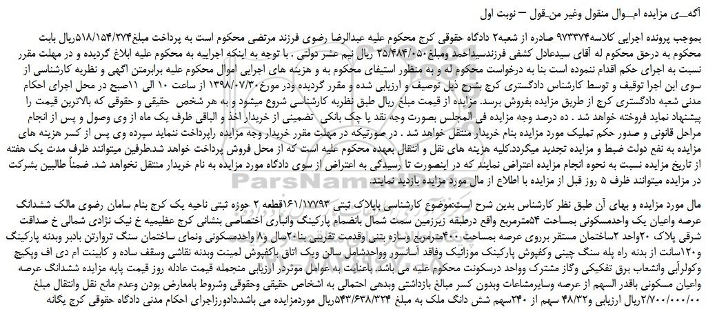 بموجب پرونده اجرایی کلاسه973374 صادره از شعبه2 دادگاه حقوقی کرج محکوم علیه عبدالرضا رضوی فرزند مرتضی محکوم است به پرداخت مبلغ518/154/274ریال بابت محکوم به درحق محکوم له آقای سیدعادل کشفی فرزندسیداحمد ومبلغ25/484/050 ریال نیم عشر دولتی . با توجه به اینکه اجراییه به محکوم علیه ابلاغ گردیده و در مهلت مقرر نسبت به اجرای حکم اقدام ننموده است بنا به درخواست محکوم له و به منظور استیفای محکوم به و هزینه های اجرایی اموال محکوم علیه برابرمتن اگهی و نظریه کارشناسی از سوی این اجرا توقیف و توسط کارشناس دادگستری کرج بشرح ذیل توصیف و ارزیابی شده و مقرر گردیده ودر مورخ1398/07/30 از ساعت 10 الی 11صبح در محل اجرای احکام مدنی شعبه دادگستری کرج از طریق مزایده بفروش برسد. مزایده از قیمت مبلغ ریال طبق نظریه کارشناسی شروع میشود و به هر شخص  حقیقی و حقوقی که بالاترین قیمت را پیشنهاد نماید فروخته خواهد شد . ده درصد وجه مزایده فی المجلس بصورت وجه نقد یا چک بانکی  تضمینی از خریدار اخذ و الباقی ظرف یک ماه از وی وصول و پس از انجام مراحل قانونی و صدور حکم تملیک مورد مزایده بنام خریدار منتقل خواهد شد . در صورتیکه در مهلت مقرر خریدار وجه مزایده راپرداخت ننماید سپرده وی پس از کسر هزینه های مزایده به نفع دولت ضبط و مزایده تجدید میگردد.کلیه هزینه های نقل و انتقال بعهده محکوم علیه است که از محل فروش پرداخت خواهد شد.طرفین میتوانند ظرف مدت یک هفته از تاریخ مزایده نسبت به نحوه انجام مزایده اعتراض نمایند که در اینصورت تا رسیدگی به اعتراض از سوی دادگاه مورد مزایده به نام خریدار منتقل نخواهد شد. ضمناً طالبین بشرکت در مزایده میتوانند ظرف 5 روز قبل از مزایده با اطلاع از مال مورد مزایده بازدید نمایند.