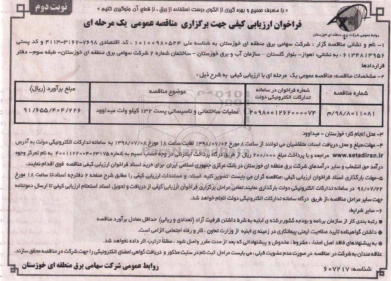 | 98/8011081/م | 2098001262000074 | عملیات ساختمانی و تاسیساتی پست 132 کیلوولت میداوود |