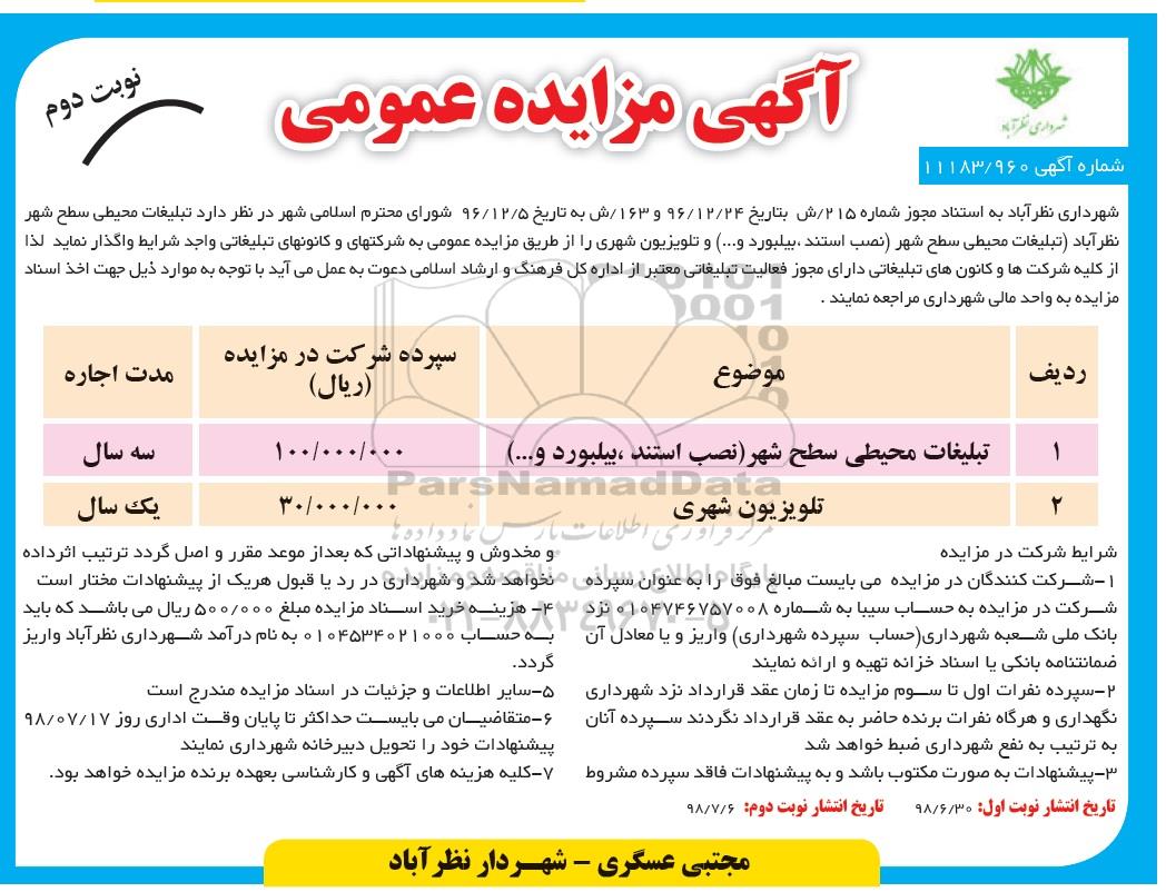 شهرداری نظرآباد به استناد مجوز شماره 215/ ش به تاریخ 96.12.24 و 163/ش به تاریخ 96.12.5 شورای محترم اسلامی شهر در نظر دارد تبلیغات محیطی سطح شهر نظرآباد (تبلیغات محیطی سطح شهر (نصب استند، بیلبورد و...) و تلویزیون شهری را از طریق مزایده عمومی به شرکتها و کانون های تبلیغاتی واجد شرایط واگذار نماید. لذا از کلیه شرکتها و کانون های تبلیغاتی دارای مجوز فعالیت تبلیغاتی معتبر از اداره کل فرهنگ و ارشاد اسلامی دعوت به عمل می آید با توجه به موارد ذیل جهت اخذ اسناد مزایده به واحد مالی شهرداری مراجعه نمایند