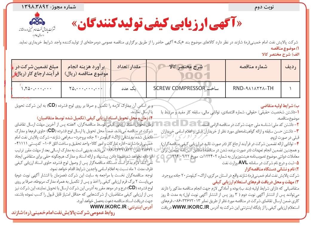 مناقصه ساخت SCREW COMPRESSOR نوبت دوم , مناقصه , مناقصه ساخت SCREW COMPRESSOR نوبت دوم