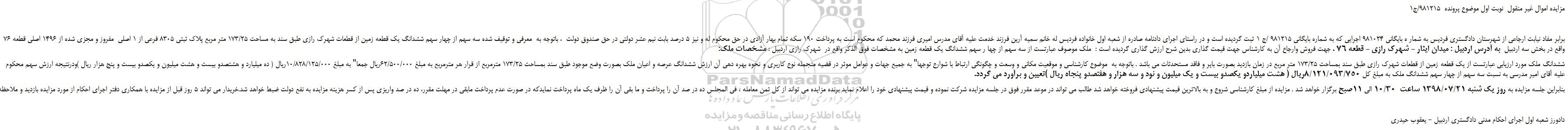 مزایده اموال غیر منقول نوبت اول موضوع پرونده 981215/ج1