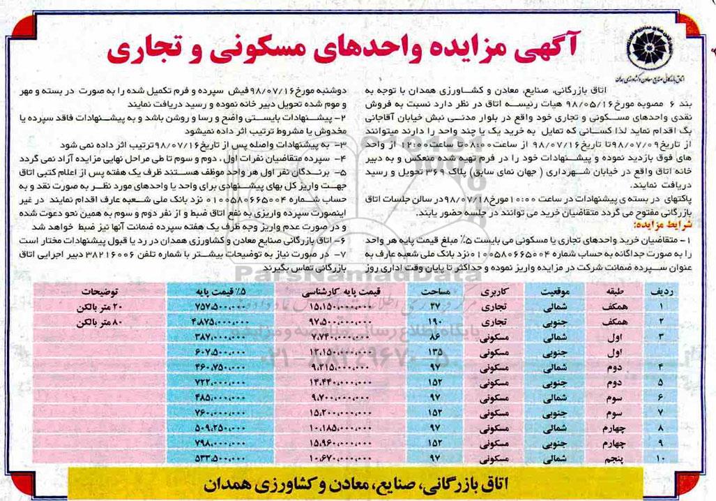 مزایده عمومی مزایده فروش نقدی واحدهای مسکونی و تجاری برگزار میگردد. از کلیه افراد متخصص و شرکتهای واجد شرایط دعوت به عمل میآید تا در این مزایده با کد خبرگزاری پارس نماد : 1921172 شرکت نمایند تاریخ شروع مزایده : 1398/07/07 مهلت شرکت در مزایده: تا پایان روز 1398/07/16 مکان برگزاری اموال واگذاری استانهای همدان و دستهبندیهای مربوط به این حراجی املاک و زمین میباشد.