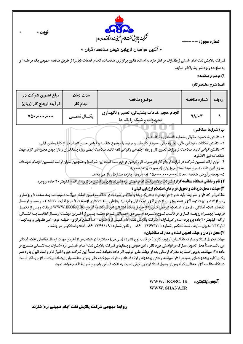 شرکت پالایش نفت امام خمینی (ره) شازند در نظر دارد به استناد قانون برگزاری مناقصات، انجام خدمات ذیل را از طریق مناقصه عمومی یک مرحله ای به پیمانکار واجد شرایط واگذار نماید.