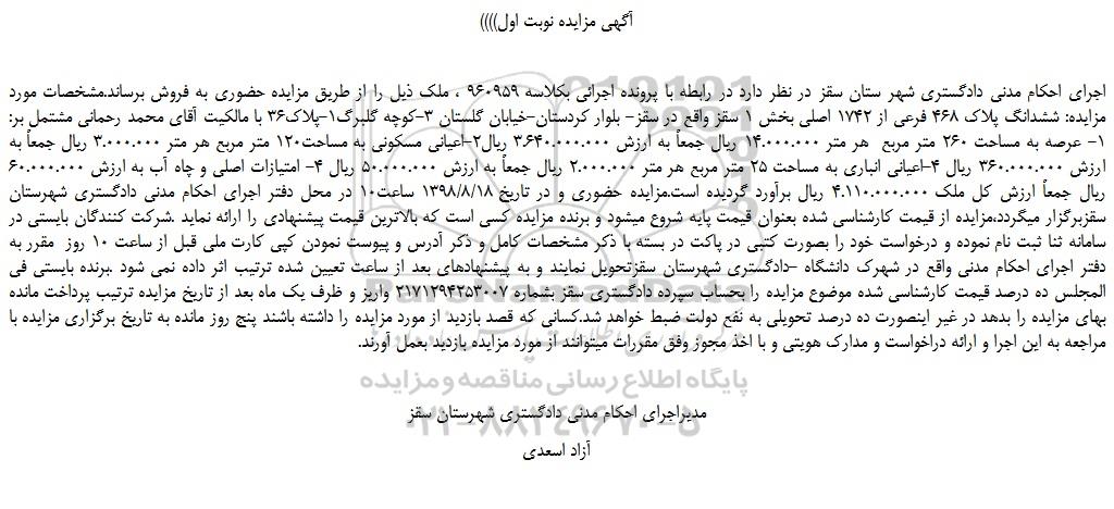 اجرای احکام مدنی دادگستری شهر ستان سقز در نظر دارد در رابطه با پرونده اجرائی بکلاسه 960959 ، ملک ذیل را از طریق مزایده حضوری به فروش برساند.مشخصات مورد مزایده: ششدانگ پلاک 468 فرعی از 1742 اصلی بخش 1 سقز واقع در سقز- بلوار کردستان-خیابان گلستان 3-کوچه گلبرگ1-پلاک36 با مالکیت آقای محمد رحمانی مشتمل بر: 1- عرصه به مساحت 260 متر مربع  هر متر 14.000.000 ریال جمعاً به ارزش 3.640.000.000 ریال2-اعیانی مسکونی به مساحت120 متر مربع هر متر 3.000.000 ریال جمعاً به ارزش 360.000.000 ریال 4-اعیانی انباری به مساحت 25 متر مربع هر متر 2.000.000 ریال جمعاً به ارزش 50.000.000 ریال 4- امتیازات اصلی و چاه آب به ارزش 60.000.000 ریال جمعاً ارزش کل ملک 4.110.000.000 ریال برآورد گردیده است.مزایده حضوری و در تاریخ 1398/8/18 ساعت10 در محل دفتر اجرای احکام مدنی دادگستری شهرستان سقزبرگزار میگردد،مزایده از قیمت کارشناسی شده بعنوان قیمت پایه شروع میشود و برنده مزایده کسی است که بالاترین قیمت پیشنهادی را ارائه نماید .شرکت کنندگان بایستی در سامانه ثنا ثبت نام نموده و درخواست خود را بصورت کتبی در پاکت در بسته با ذکر مشخصات کامل و ذکر آدرس و پیوست نمودن کپی کارت ملی قبل از ساعت 10 روز  مقرر به دفتر اجرای احکام مدنی واقع در شهرک دانشگاه -دادگستری شهرستان سقزتحویل نمایند و به پیشنهادهای بعد از ساعت تعیین شده ترتیب اثر داده نمی شود .برنده بایستی فی المجلس ده درصد قیمت کارشناسی شده موضوع مزایده را بحساب سپرده دادگستری سقز بشماره 2171294253007 واریز و ظرف یک ماه بعد از تاریخ مزایده ترتیب پرداخت مانده بهای مزایده را بدهد در غیر اینصورت ده درصد تحویلی به نفع دولت ضبط خواهد شد.کسانی که قصد بازدید از مورد مزایده را داشته باشند پنج روز مانده به تاریخ برگزاری مزایده با مراجعه به این اجرا و ارائه دراخواست و مدارک هویتی و با اخذ مجوز وفق مقررات میتوانند از مورد مزایده بازدید بعمل آورند.