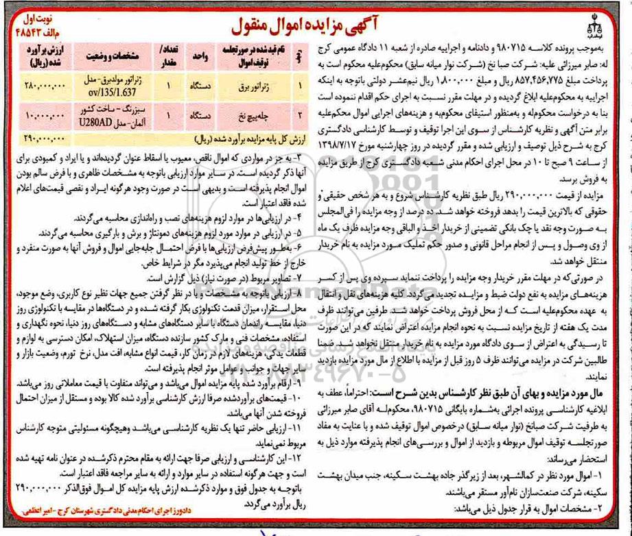 اموال مورد مزایده: ژنراتور برق - چله پیچ نخ