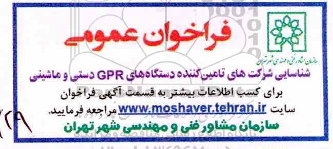 فراخوان دستگاه های GPR دستی و ماشینی از کلیه افراد متخصص و شرکتها واجد شرایط دعوت به عمل میآید در مناقصه با کد خبرگزاری پارس نماد: 1924568 شرکت نمایند.