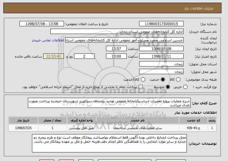 شرح کلی نیاز: شرح عملیات پروژه تعمیرات اساسیکتابخانه عمومی توحید روستای سوکهریز شهرستان خرمدره پرداخت بصورت نقدی میباشد