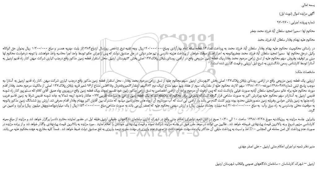 در راستای محکومیت محکوم علیه بهنام وفادار سلطان آباد فرزند محمد به پرداخت تعداد14 قطعه سکه تمام بهارآزادی ومبلغ120/000/000ریال وجه نقدبه نرخ شاخص روز(سال ازدواج1384)از بابت مهریه همسر و مبلغ 1/200/000 ریال بعنوان حق الوکاله وکیل درحق محکوم لها سمیرا تمجید سلطان آباد فرزند محمد جعفروباتوجه به احراز اعسار موقت خواهان از پرداخت هزینه دادرسی و نیم عشر دولتی در حق صندوق دولت که پس ازاجرای حکم توسط واحد اجرا محاسبه واخذ خواهدشد. با توجه درخواست محکوم لها مبنی بر توقیف وفروش سهم محکوم علیه از نسق زراعی مرحوم محمد وفادار،یک قطعه زمین مزروعی واقع در اراضی روستای بابلان پلاک127 اصلی بخش 3شهرستان اردبیل ،محل استقرار قطعه زمین مذکور واقع درجنب انباری شرکت میهن کنار راه قدیم اردبیل به آستارا توسط کارشناس رسمی دادگستری به شرح ذیل ارزیابی و قیمت گذاری شده است./.