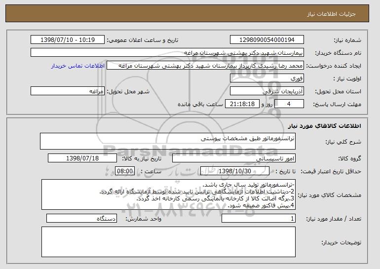 نام دستگاه خریدار:بیمارستان شهید دکتر بهشتی شهرستان مراغه