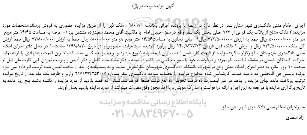 اجرای احکام مدنی دادگستری شهر ستان سقز در نظر دارد در رابطه با پرونده اجرائی بکلاسه 980171 ، ملک ذیل را از طریق مزایده حضوری به فروش برساند.مشخصات مورد مزایده: 2 دانگ مشاع از پلاک یک فرعی از 723 اصلی بخش یک سقز واقع در سقز-خیابان امام با مالکیت آقای محمد سعیدزاده مشتمل بر: 1- عرصه به مساحت 14/45 متر مربع هر متر 50/000/000 ریال جمعاً به ارزش 722/500/000 ریال2-اعیانی تجاری به مساحت14/56 متر مربع هر متر 5/000/000 ریال جمعاً به ارزش 72/800/000 ریال جمعاً ارزش کل ملک 722/500/000 ریال و ارزش 2 دانگ قابل فروش 240/833/333 ریال برآورد گردیده است.مزایده حضوری و در تاریخ 1398/8/20 ساعت10 در محل دفتر اجرای احکام مدنی دادگستری شهرستان سقزبرگزار میگردد،مزایده از قیمت کارشناسی شده بعنوان قیمت پایه شروع میشود و برنده مزایده کسی است که بالاترین قیمت پیشنهادی را ارائه نماید .شرکت کنندگان بایستی در سامانه ثنا ثبت نام نموده و درخواست خود را بصورت کتبی در پاکت در بسته با ذکر مشخصات کامل و ذکر آدرس و پیوست نمودن کپی کارت ملی قبل از ساعت 10 روز مقرر به دفتر اجرای احکام مدنی واقع در شهرک دانشگاه -دادگستری شهرستان سقزتحویل نمایند و به پیشنهادهای بعد از ساعت تعیین شده ترتیب اثر داده نمی شود .برنده بایستی فی المجلس ده درصد قیمت کارشناسی شده موضوع مزایده را بحساب سپرده دادگستری سقز بشماره 2171294253007 واریز و ظرف یک ماه بعد از تاریخ مزایده ترتیب پرداخت مانده بهای مزایده را بدهد در غیر اینصورت ده درصد تحویلی به نفع دولت ضبط خواهد شد.کسانی که قصد بازدید از مورد مزایده را داشته باشند پنج روز مانده به تاریخ برگزاری مزایده با مراجعه به این اجرا و ارائه دراخواست و مدارک هویتی و با اخذ مجوز وفق مقررات میتوانند از مورد مزایده بازدید بعمل آورند.