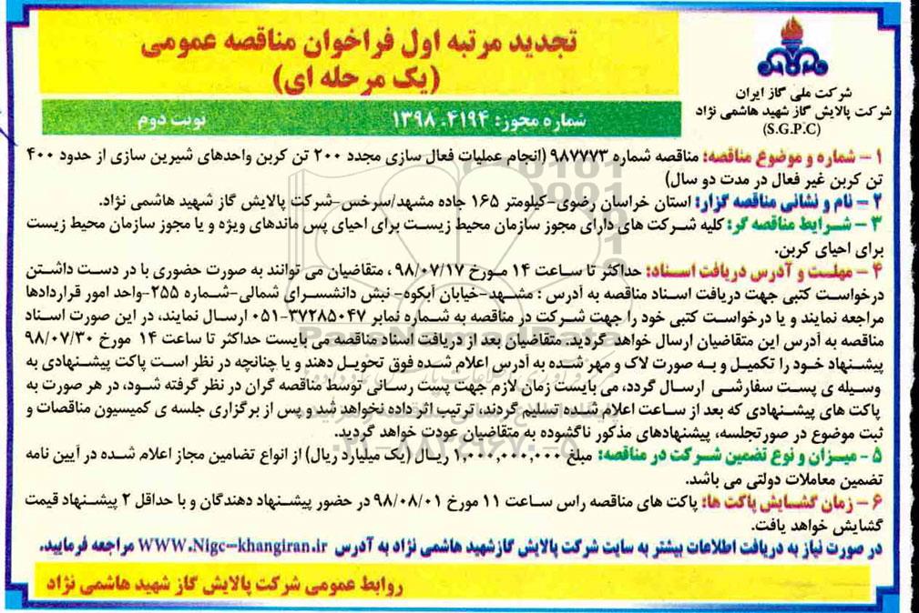 تجدید مناقصه انجام عملیات فعال سازی مجدد 200 تن کربن واحدهای شیرین سازی- نوبت دوم , تجدید فراخوان مناقصه , تجدید مناقصه انجام عملیات فعال سازی مجدد 200 تن کربن واحدهای شیرین سازی- نوبت دوم