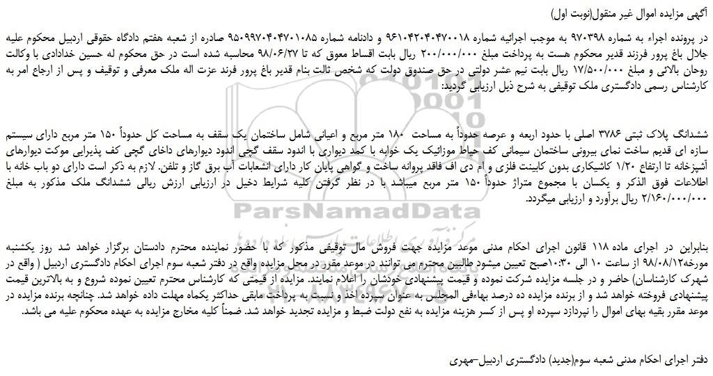 در پرونده اجراء به شماره 970398 به موجب اجرائیه شماره 961042040470018 و دادنامه شماره 9509970404701085 صادره از شعبه هفتم دادگاه حقوقی اردبیل محکوم علیه جلال باغ پرور فرزند قدیر محکوم هست به پرداخت مبلغ 200/000/000 ریال بابت اقساط معوق که تا 98/06/27 محاسبه شده است در حق محکوم له حسین خدادادی با وکالت روحان بالائی و مبلغ 17/500/000 ریال بابت نیم عشر دولتی در حق صندوق دولت که شخص ثالت بنام قدیر باغ پرور فرند عزت اله ملک معرفی و توقیف و پس از ارجاع امر به کارشناس رسمی دادگستری ملک توقیفی به شرح ذیل ارزیابی گردید: