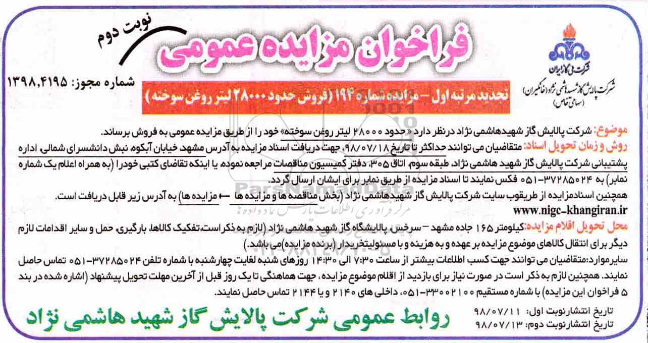 موضوع: شركت پالایش گاز شهید هاشمی نژاد در نظر دارد (حدود 28000 لیتر روغن سوخته) خود را از طریق مزایده عمومی به فروش برساند.