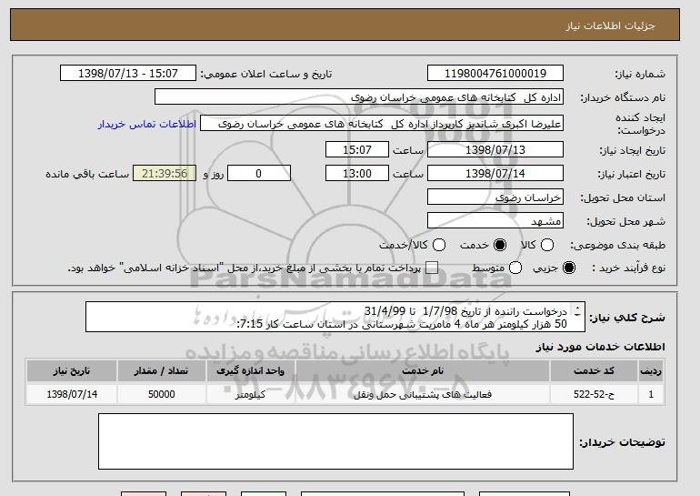 شرح کلی نیاز: درخواست راننده از تاریخ 1/7/98 تا 31/4/99