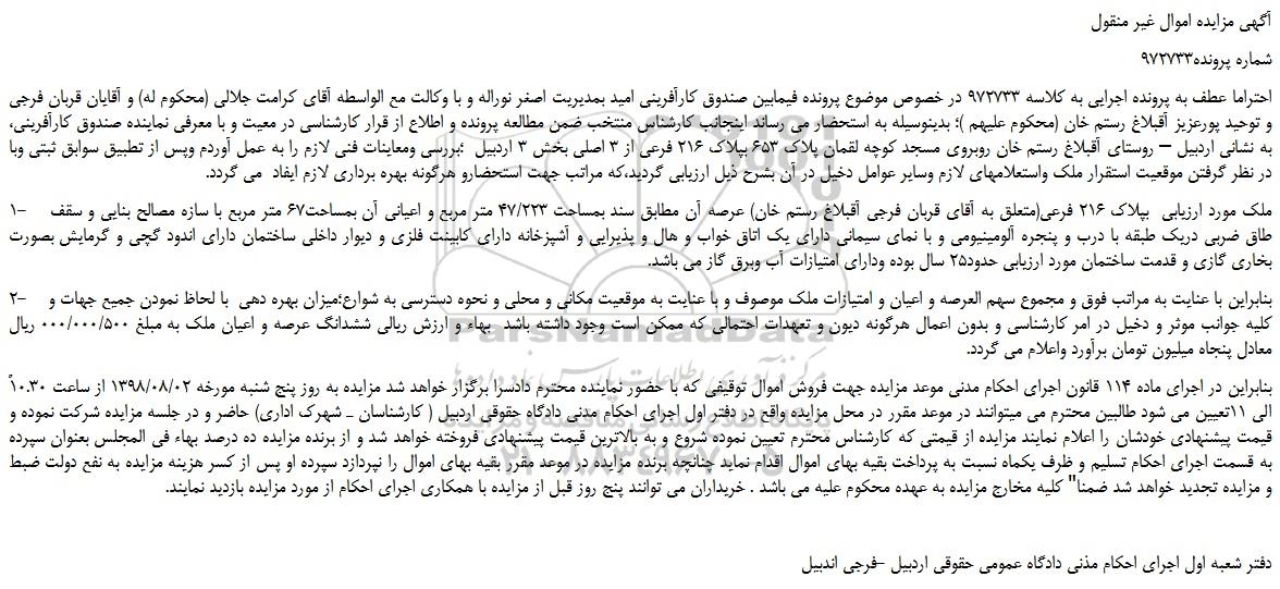 ًبنابراین در اجرای ماده 114 قانون اجرای احکام مدنی موعد مزایده جهت فروش اموال توقیفی که با حضور نماینده محترم دادسرا برگزار خواهد شد مزایده به روز پنج شنبه مورخه 1398/08/02 از ساعت 10.30 الی 11تعیین می شود طالبین محترم می میتوانند در موعد مقرر در محل مزایده واقع در دفتر اول اجرای احکام مدنی دادگاه حقوقی اردبیل ( کارشناسان ـ شهرک اداری) حاضر و در جلسه مزایده شرکت نموده و قیمت پیشنهادی خودشان را اعلام نمایند مزایده از قیمتی که کارشناس محترم تعیین نموده شروع و به بالاترین قیمت پیشنهادی فروخته خواهد شد و از برنده مزایده ده درصد بهاء فی المجلس بعنوان سپرده به قسمت اجرای احکام تسلیم و ظرف یکماه نسبت به پرداخت بقیه بهای اموال اقدام نماید چنانچه برنده مزایده در موعد مقرر بقیه بهای اموال را نپردازد سپرده او پس از کسر هزینه مزایده به نفع دولت ضبط و مزایده تجدید خواهد شد ضمنا" کلیه مخارج مزایده به عهده محکوم علیه می باشد . خریداران می توانند پنج روز قبل از مزایده با همکاری اجرای احکام از مورد مزایده بازدید نمایند.