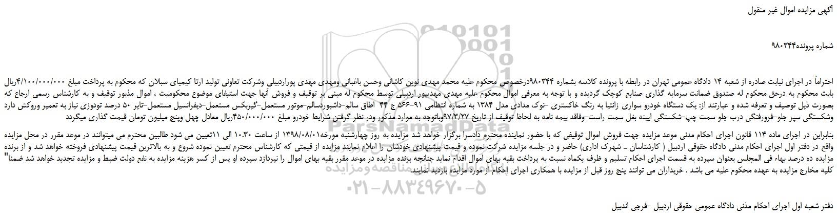 احتراماً در اجرای نیابت صادره از شعبه 14 دادگاه عمومی تهران در رابطه با پرونده کلاسه بشماره 980344درخصوص محکوم علیه محمد مهدی نوین کاشانی وحسن باغبانی ومهدی مهدی پوراردبیلی وشرکت تعاونی تولید ارتا کیمیای سبلان که محکوم به پرداخت مبلغ 4/100/000/000ریال بابت محکوم به درحق محکوم له صندوق ضمانت سرمایه گذاری صنایع کوچک گردیده و با توجه به معرفی اموال محکوم علیه مهدی مهدیپور اردبیلی توسط محکوم له مبنی بر توقیف و فروش آنها جهت استیفای موضوع محکومیت ، اموال مذبور توقیف و به کارشناس رسمی ارجاع که بصورت ذیل توصیف و تعرفه شده و عبارتند از: یک دستگاه خودرو سواری زانتیا به رنگ خاکستری -نوک مدادی مدل 1384 به شماره انتظامی 91-566 ج 44 اطاق سالم-داشبوردسالم-موتور مستعمل-گیربکس مستعمل-دیفرانسیل مستعمل-تایر 50 درصد تودوزی نیاز به تعمیر وروکش دارد وشکستگی سپر جلو-فرورفتگی درب جلو سمت چپ-شکستگی ایینه بغل سمت راست-وفاقد بیمه نامه به لحاظ توقیف از تاریخ 97/3/27وباتوجه به موارد مذکور ودر نظر گرفتن شرایط خودرو مبلغ 450/000/000ریال معادل چهل وپنج میلیون تومان قیمت گذاری میگردد