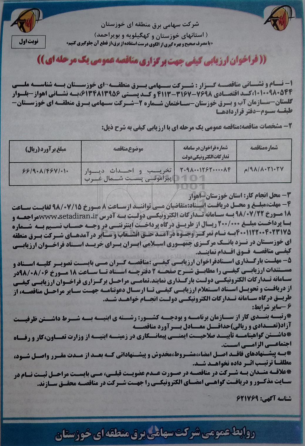 مناقصه تخریب و احداث دیوار پیرامونی پست شمال غرب, فراخوان ارزیابی کیفی, مناقصه تخریب و احداث دیوار پیرامونی پست شمال غرب