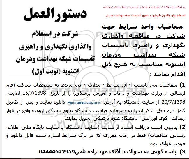شرکت در استعلام واگذاری نگهداری و راهبری تاسیسات شبکه بهداشت و درمان اشنویه (نوبت اول)